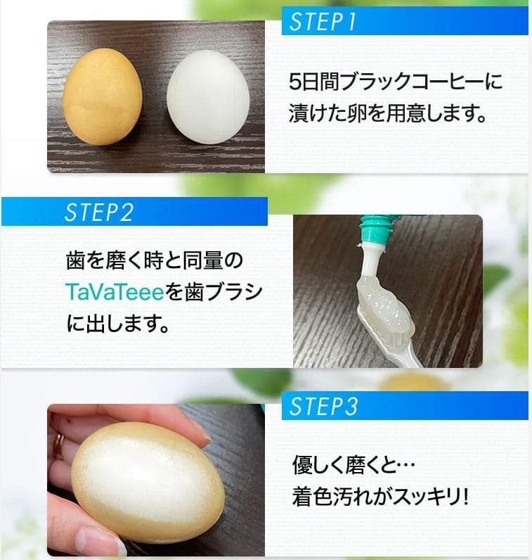 TaVaTeeeには最新ホワイトニングにも使われる3つの有効成分ポリリン酸ナトリウム、β-グリチルレチン酸、イソプロピルメチルフェノールを配合。従来のケアでは落とせない、浸透した着色汚れを浮かせて分解することで、歯を本来の白さへと変えていきます。